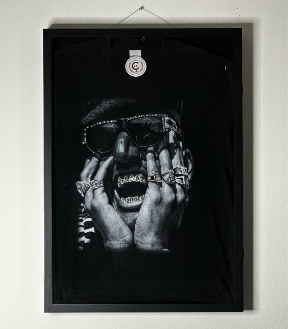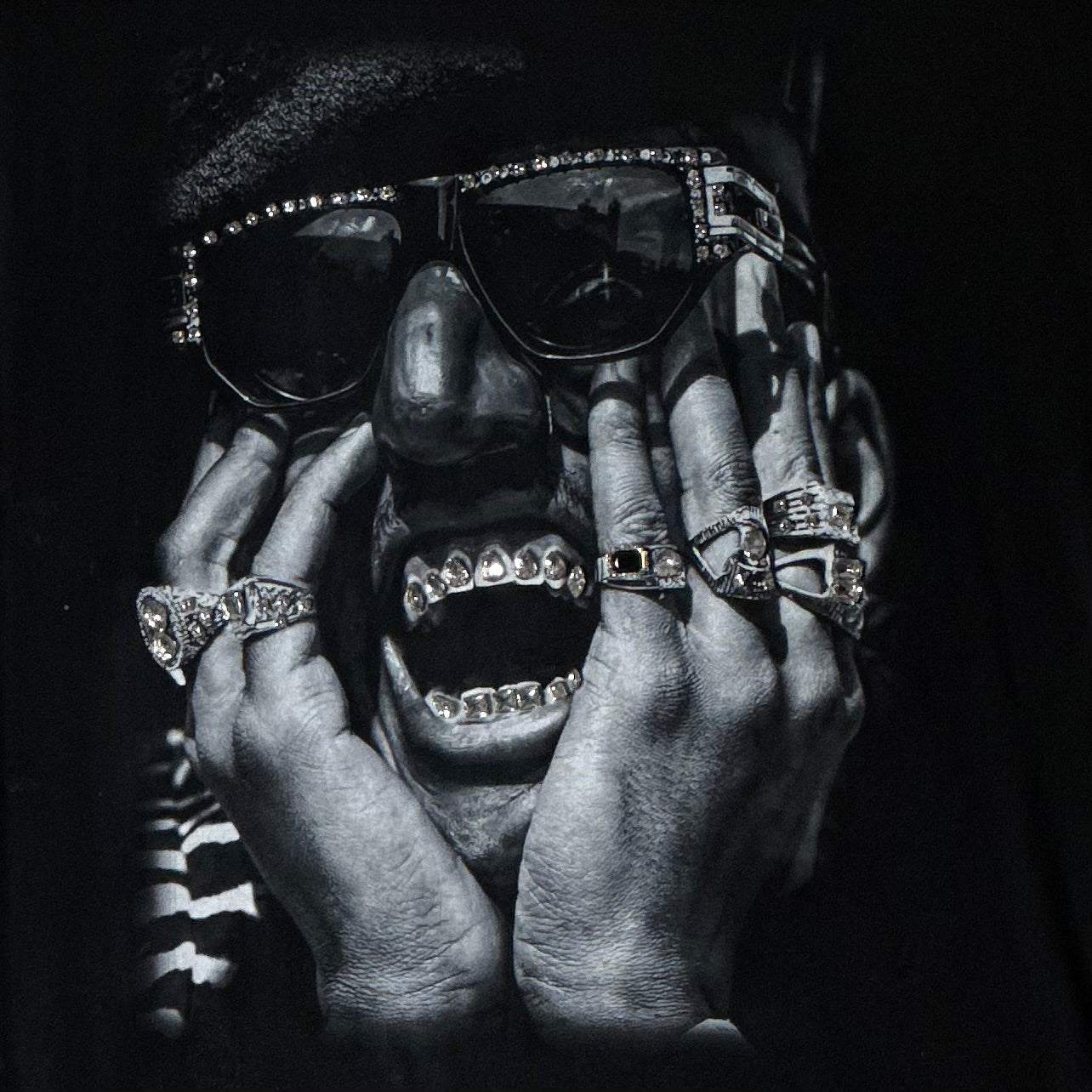 This dazzling shirt captures the incomparable charisma of Shock G, the visionary frontman of the iconic Digital Underground. The design showcases him adorned with exquisite gemstone accents on his rings, glasses, and even his grill, each facet catching and refracting the light in mesmerizing brilliance. When illuminated, the shimmering stones create a kaleidoscope of sparkle, amplifying the artistry of the piece and reflecting Shock G’s larger-than-life persona. A true statement garment, it blends street culture heritage with high-end craftsmanship, making it both a tribute to hip-hop royalty and a wearable work of art.
